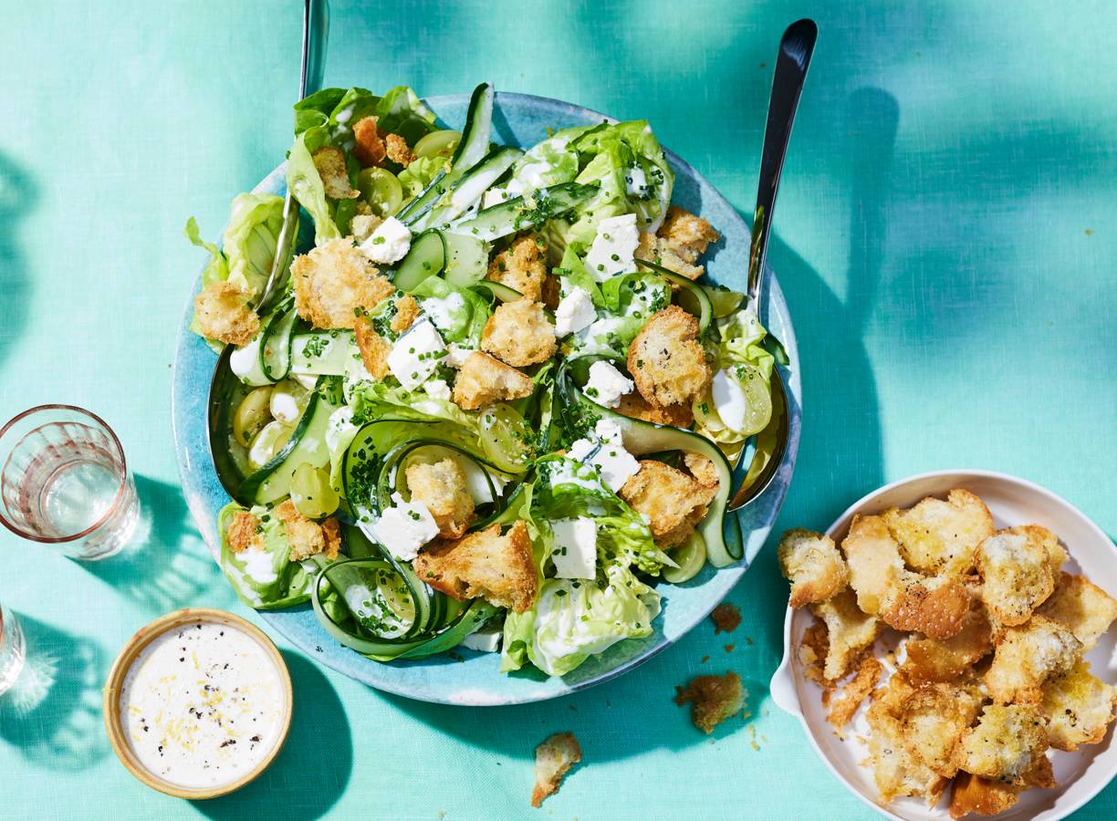 Knapperige croutons, romige kaasdressing, zoete druiven en verse sla met komkommer - deze salade is een zomers feestje op tafel!