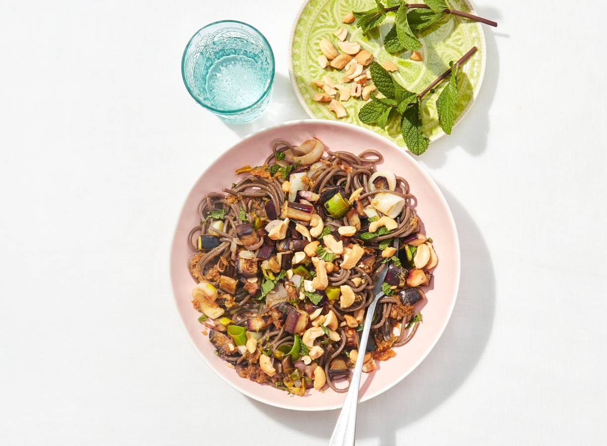 Noedelsalade met aubergine, prei, munt en cashewnoten