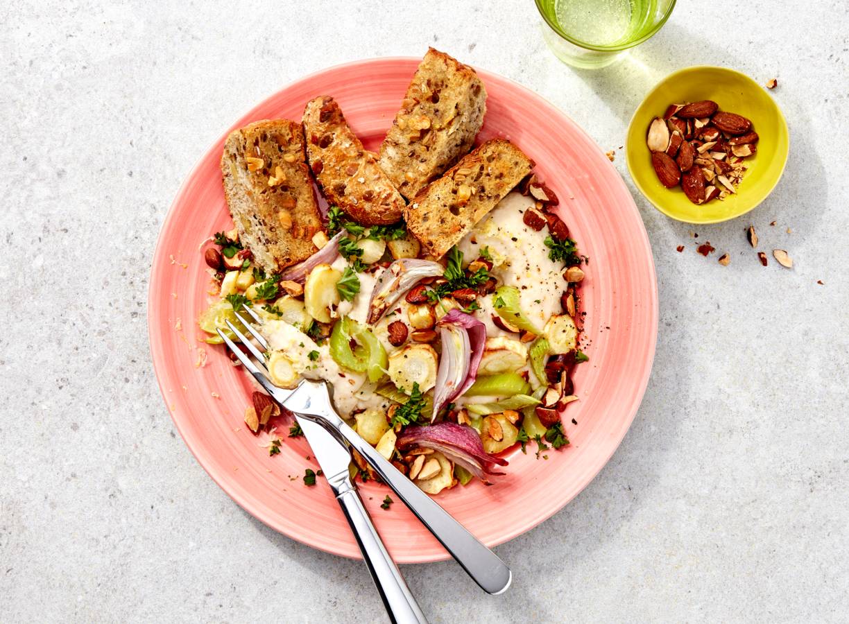 Kikkererwtenpuree met bleekselderij, wortelpeterselie en amandel