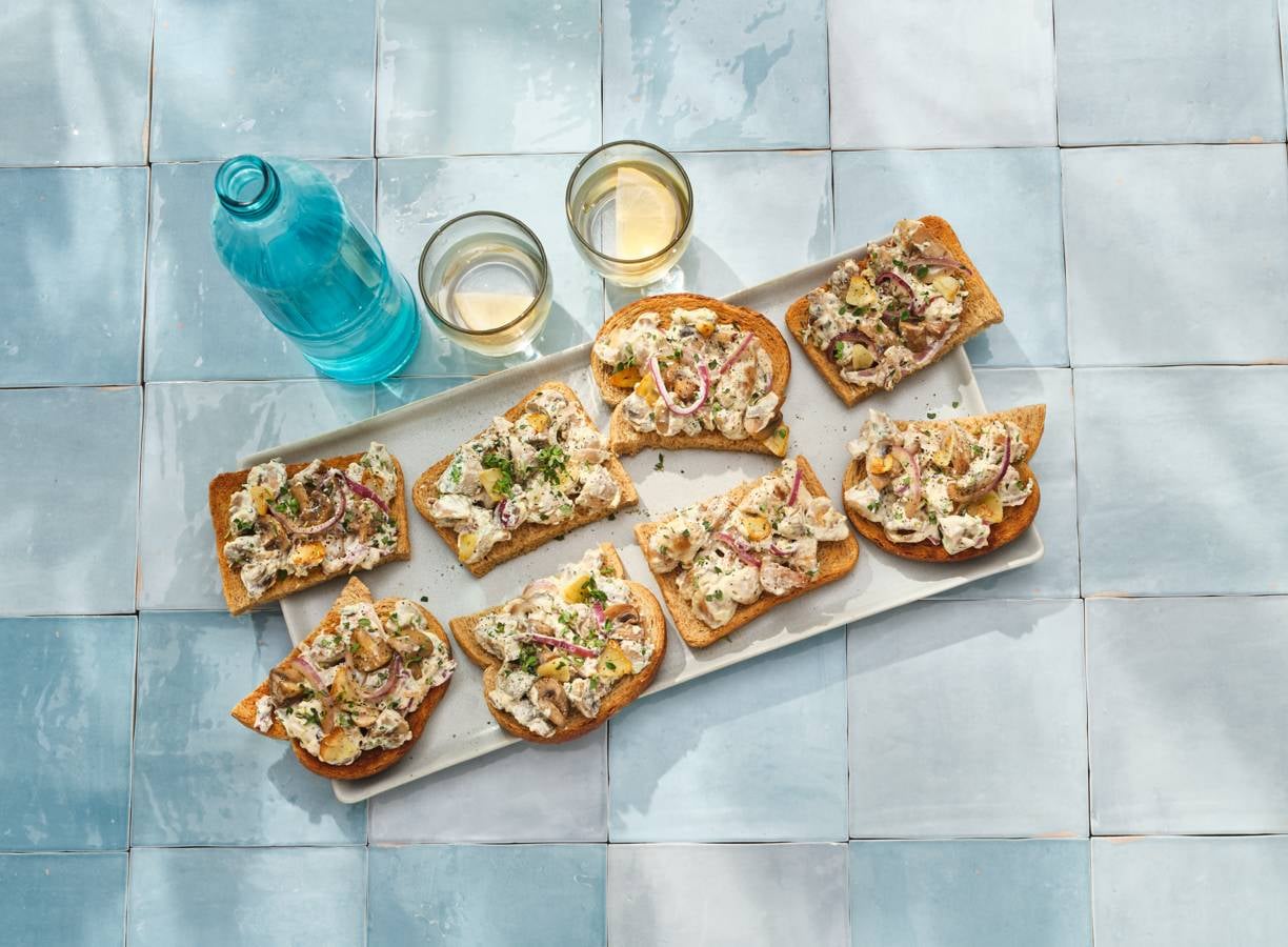 Rooster ondertussen de sneetjes brood. Verdeel de gebakken champignons over de geroosterde sneetjes brood.