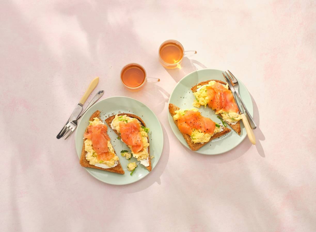 Een guilty pleasure ontbijt, maar dan gezond. Deze toast met roerei en gerookte zalm is een feest voor in de vroege uurtjes.