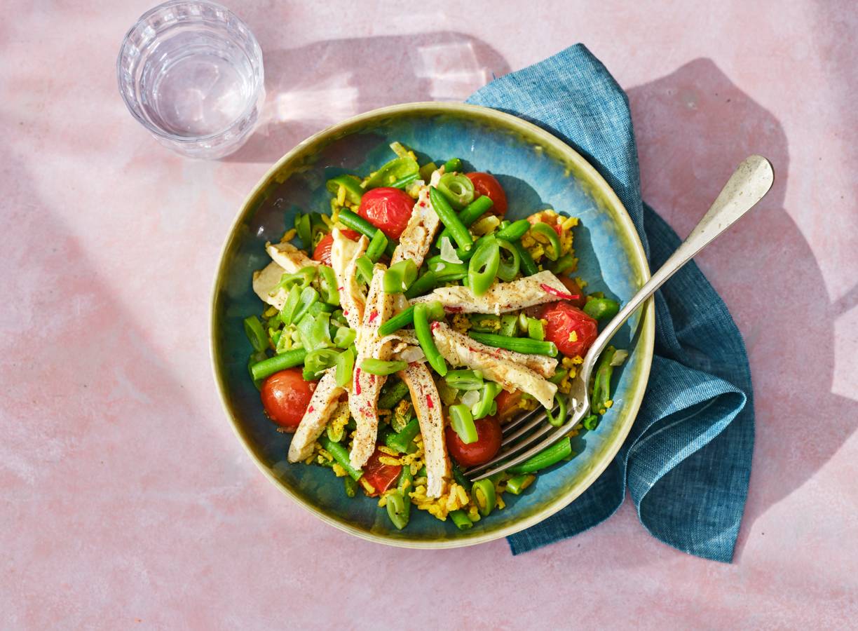 Geurige kerrierijst met bonen, tomaat en omeletreepjes is een gezonde maaltijd voor iedere dag van de week.