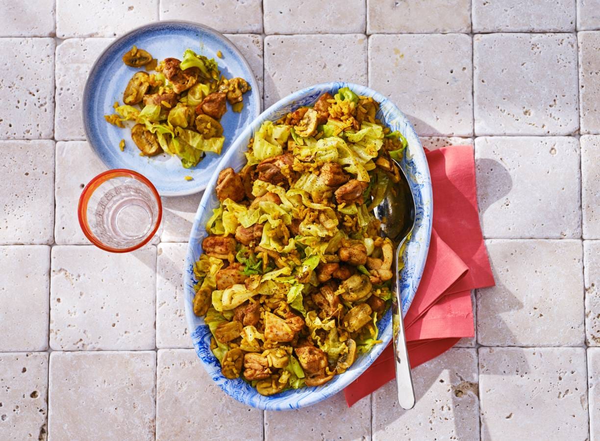 Deze kip-kerrierijstschotel met champignons en spitskool is een variatie op je andere rijstklassiekers.