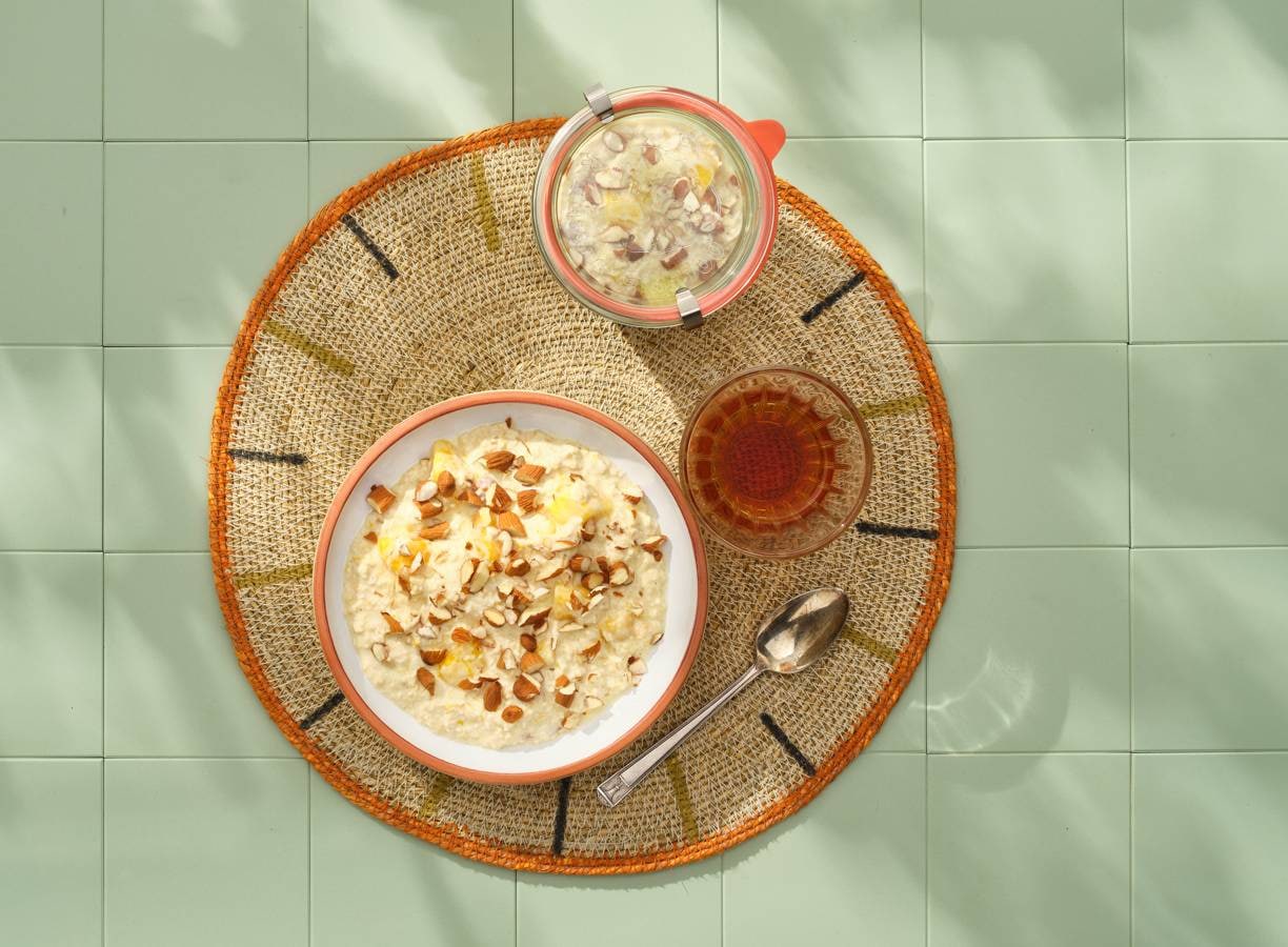 Meng de drinkyoghurt met het sinaasappelrasp en -sap, de havermout, helft van de amandelen en ⅔ van de mangostukjes. Verdeel over de kleine kommen of glazen en verdeel de rest van de mangostukjes erover. Dek de kommen af met vershoudfolie of een deksel en laat ze 1 nacht in de koelkast staan.