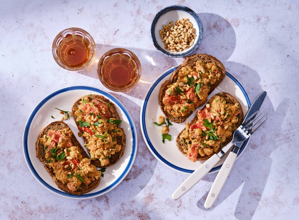 Met kikkererwten, gebakken tomaten, gerookt-paprikapoeder en tahin maak je een snelle vegan spread voor op deze toast.