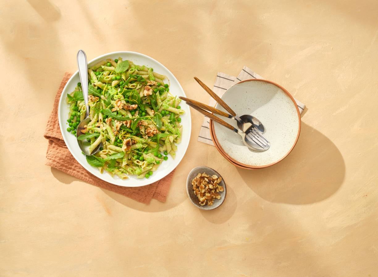 Pasta pesto maar dan met tuinerwten. Meer hoeven we niet te zeggen, toch?