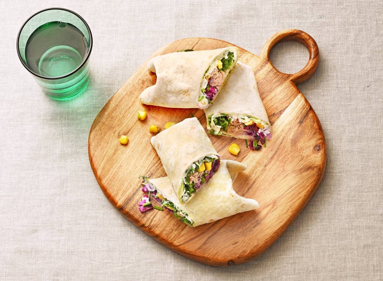 Prep je wrap: altijd een winner en zo gemaakt. Besmeer een wrap met verse roomkaas, leg er tonijn en rodekool op en rol 'm op. Voor school, werk of gewoon thuis.