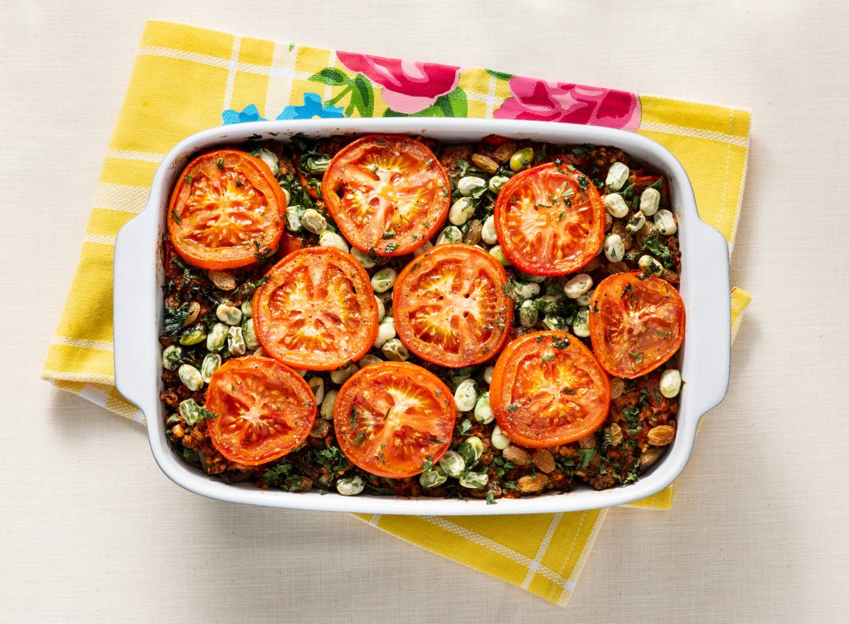 Verdeel de plakjes aardappel over de bodem van de ovenschaal. Verdeel de helft van de groenten hierover. Verdeel de helft van het gehaktmengsel hierover. Herhaal deze lagen tot alles op is. Bestrooi met de kruiden en de tuinbonen. Leg de tomaat erop en besprenkel met de rest van de olie. Zet de ovenschaal ca. 30 min. in de oven.