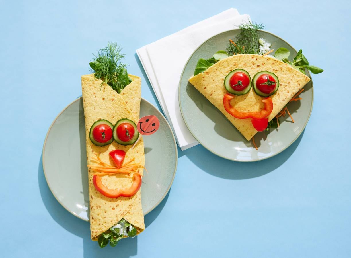 Doe de resterende veldsla in de opening van de wrap, dit is het haar. Maak op de wrap een gezichtje: de plakjes komkommer, met daarop de gehalveerde cherrytomaten zijn de ogen en een ½ paprikaring is de mond.
