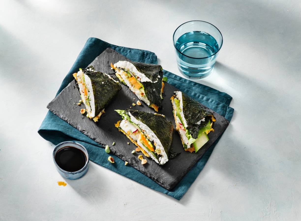 Knip 1 norivel vanaf het midden van de onderkant in tot de helft. Beleg linksboven en rechtsboven elk met 1 portie sushirijst in vierkantjes en besmeer de rijst met 1/4 van de mayonaise. Leg 1 slablaadje, 1/4 van de radijs, ¼ van de komkommer- en winterpeenlinten linksonder op het norivel.