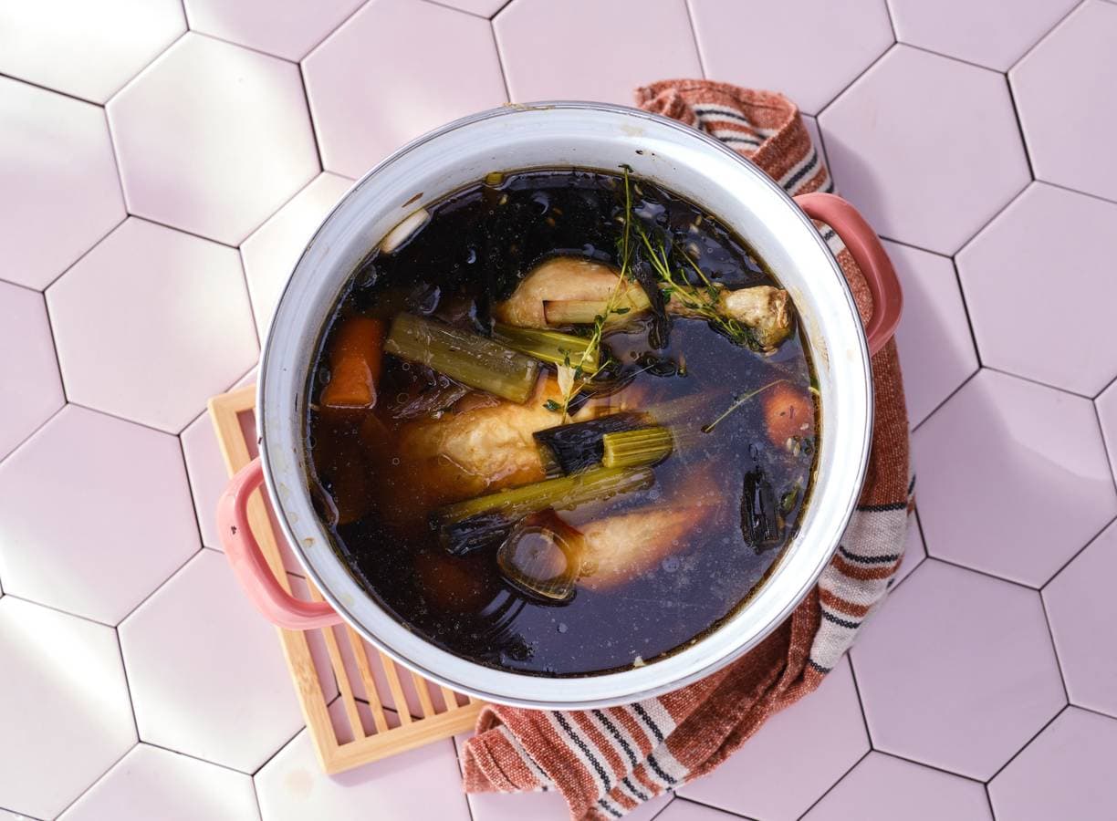 Laat de bouillon 3 uur zachtjes koken. Schep af en toe het naar boven gekomen schuim weg met een schuimspaan.