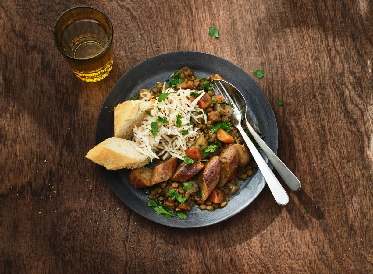 Een denderende keuken hebben onze oosterburen misschien niet, maar we zijn ze eeuwig dankbaar voor de bratwurst. Erg lekker in deze gestoofde linzenschotel met vega bratworst en selleriesalade.