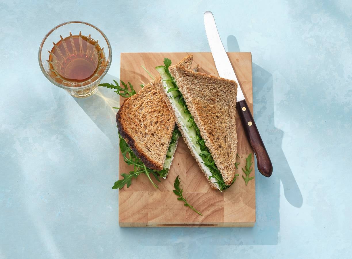 It's lunch time! Dus maken we een sandwich met zuivelspread kruiden, verse bieslook, rucola en komkommer. Zo snel, gezond, vegetarisch en budgetvriendelijk kan een goedgevulde boterham zijn.