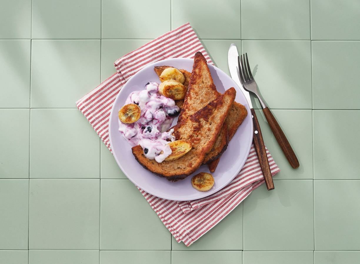 Gaan met die banaan! Wentel sneetjes volkorenbrood in een mengsel van banaan en ei en je krijgt de heerlijkste wentelteefjes. Blauwe bessenyoghurt ernaast en de dag kan beginnen.