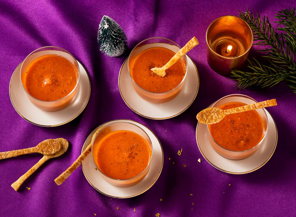 Tomatensoep ziet er extra feestelijk uit in een mooi amuseglaasje. En met een bladerdeeglepel erbij maak je het extra speciaal.