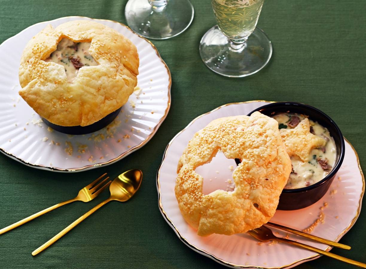 Verdeel de ragout over de ramekins en leg het bladerdeegdakje erop. Laat iedereen aan tafel met de achterkant van een lepel een tik op de ster geven, zodat deze in de ragout valt.