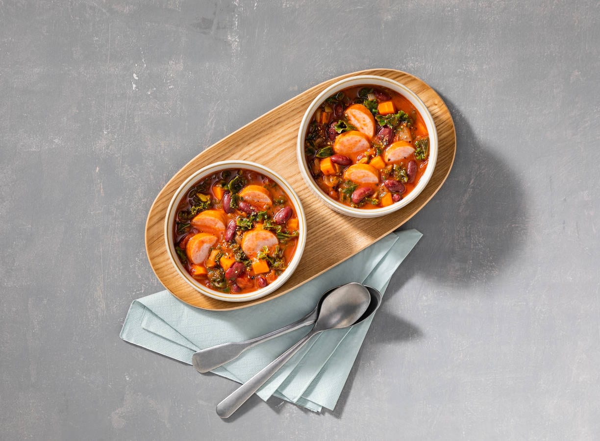 Binnen opwarmen terwijl het buiten vriest, doe je met een grote pan winterse soep op het fornuis. Deze kidneybonensoep met rookworst en boerenkool leent zich daar perfect voor.