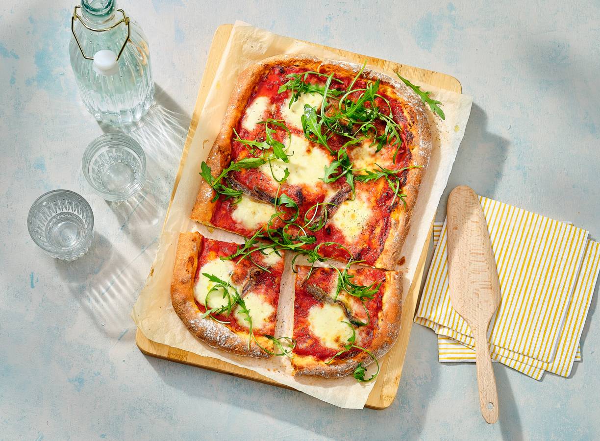 Pizza, o pizza! Waan je in Italië in je eigen keuken. Oven aan, bakplaat vullen met pizzadeeg en daarna tomaat, ansjovis en rucola erop.