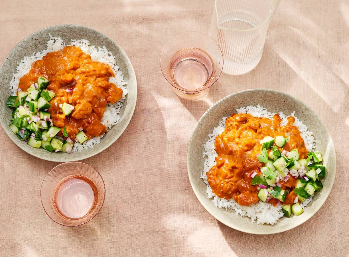Vega 'butter chicken' met tofu, rijst en frisse komkommersalade