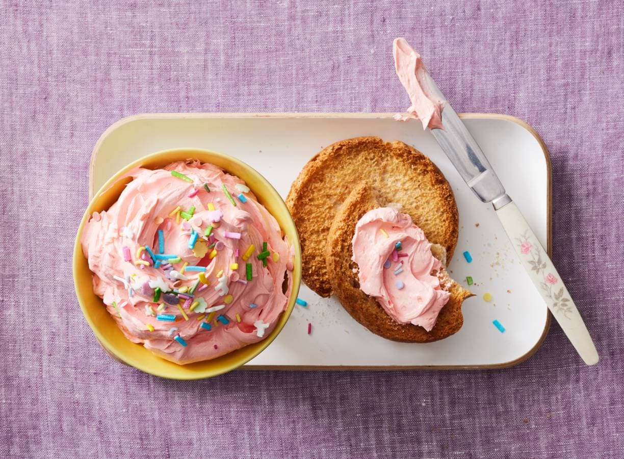 Unicornboter maak je door het opkloppen van roomboter met suiker, rode kleurstof en unicornmix er aan toegevoegd.