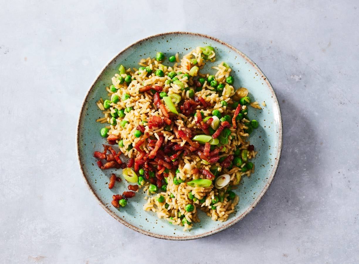 Gebakken rijst met spekjes. Máár: niet zomaar spekjes, nee: ketjap spekjes!