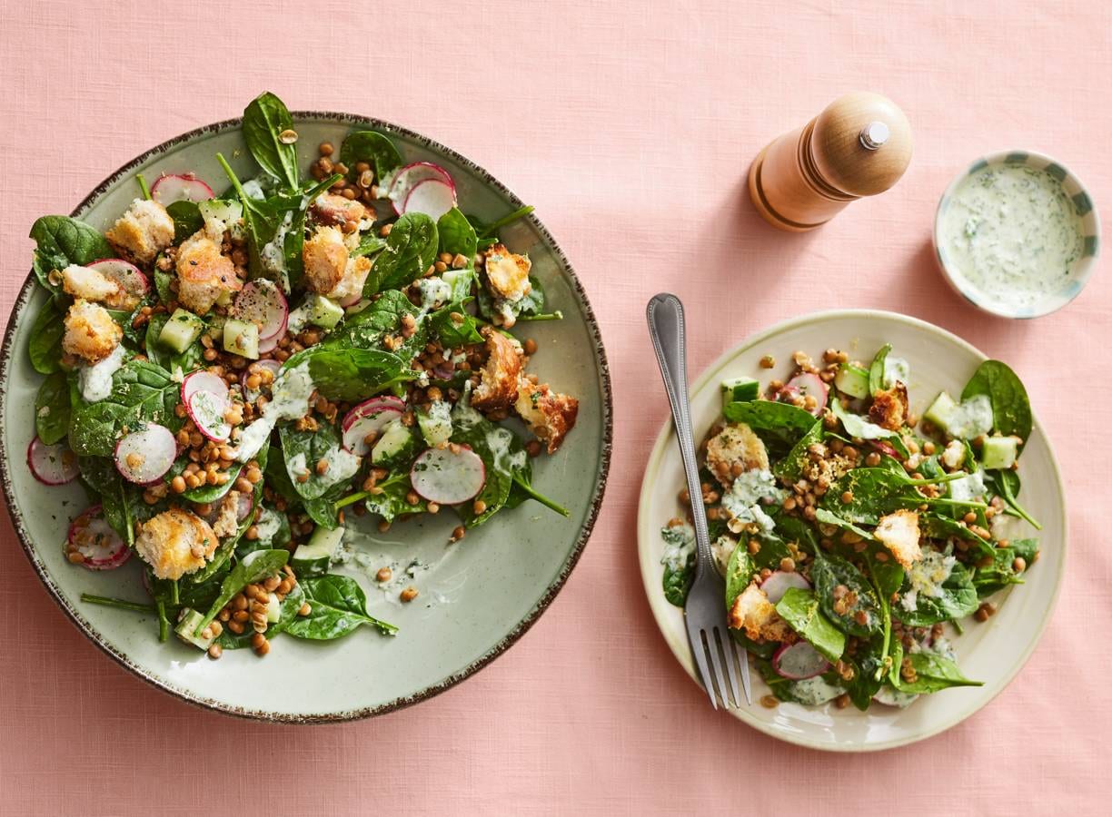 Meng de linzen met de spinazie, radijs, komkommer, de helft van de croutons en de helft van de dressing. Breng op smaak met peper en eventueel zout. Serveer de salade op een grote schaal, verdeel de rest van de dressing en croutons erover en bestrooi met de rest van het citroenrasp.