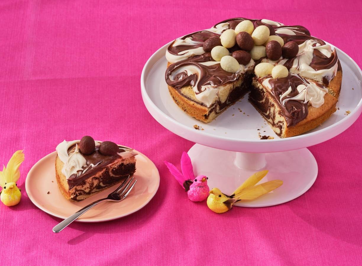 Verdeel de rest van de duo hazelnootpasta met een lepel in swirls over de bovenkant van de cake. Verdeel er de paaseitjes over.