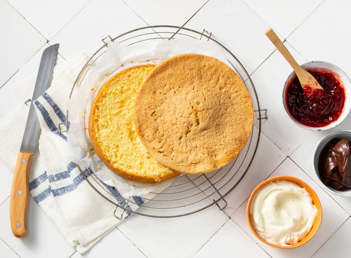 Spongecake is een goede basis voor allerlei soorten taarten. Vul 'm bijvoorbeeld met botercrème, chocoladesaus, chocoladeganache of jam.