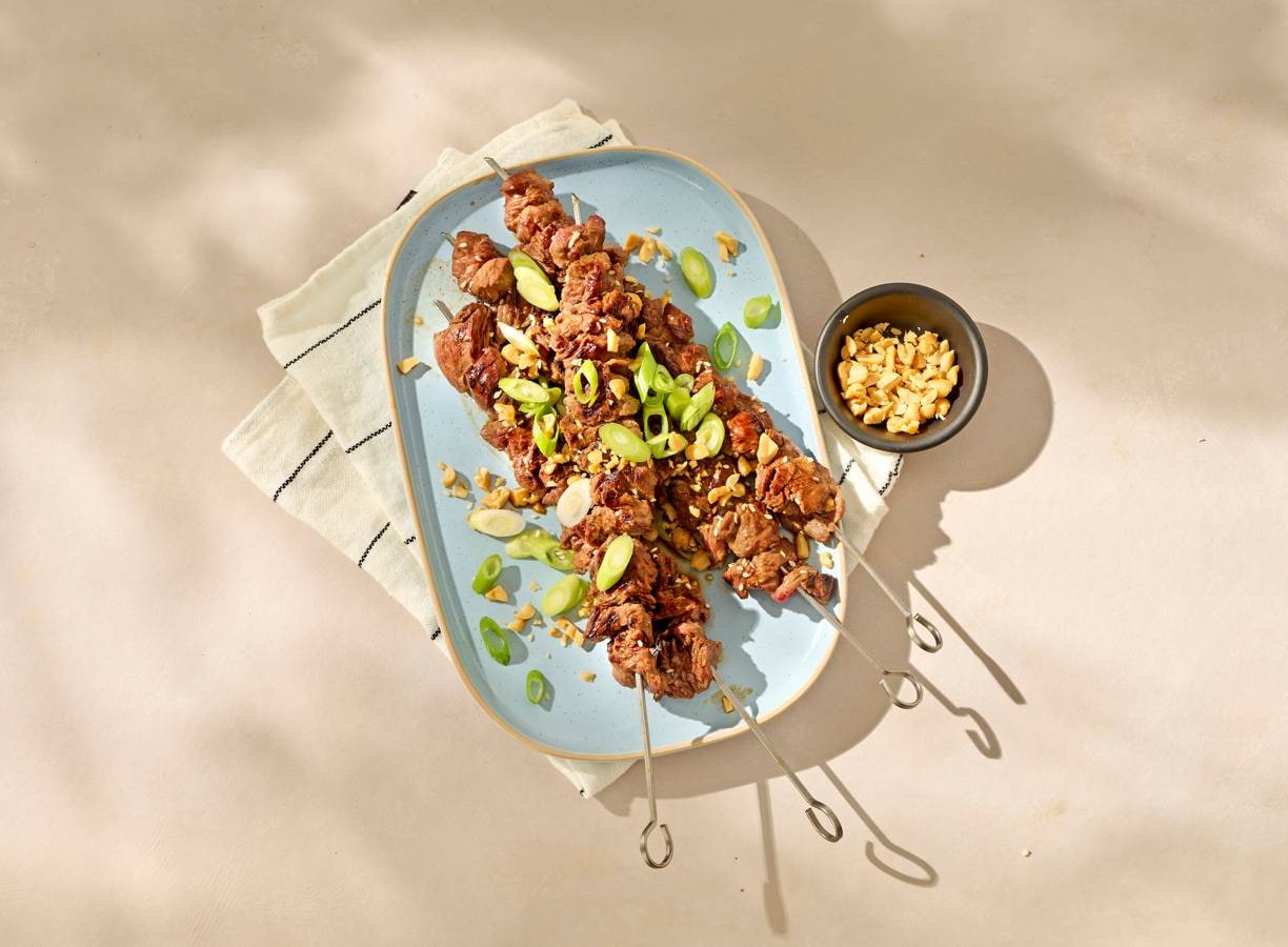 Snijd ondertussen het bosuitje fijn en hak de pinda’s fijn. Serveer de spiesjes op een bord en bestrooi met de bosui en pinda.