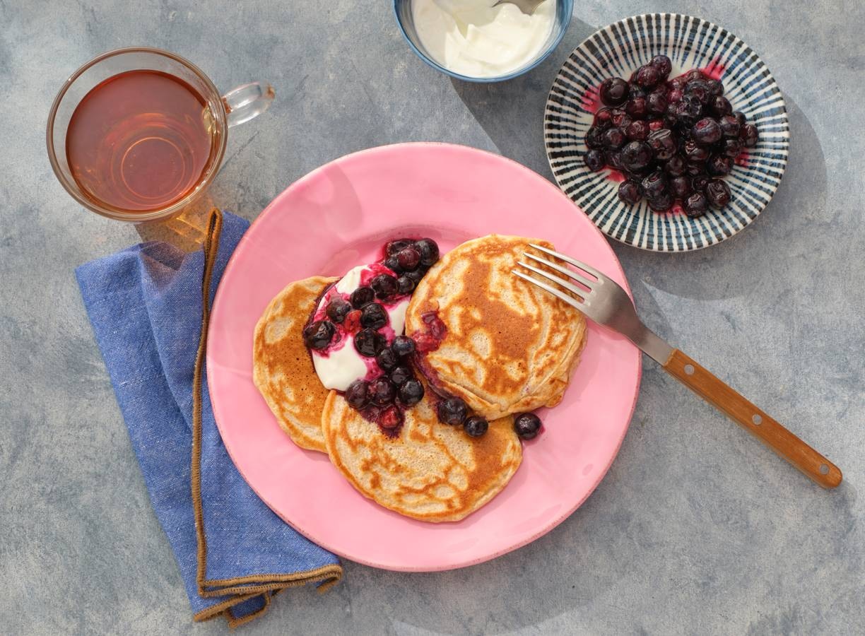 Deze proteïne pannenkoeken bevatten extra eiwitten dankzij wheypoeder in de smaak vanille. Serveer met magere kwark en top af gemarineerde bessen.