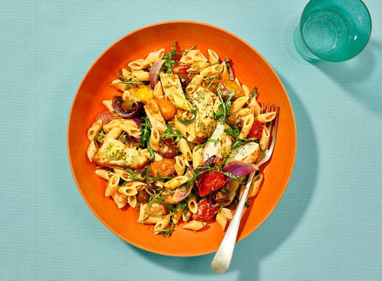 Laat ondertussen de olijven uitlekken en snijd de rucola grof. Snijd de kip in reepjes en meng met de geroosterde tomaten, olijven en rucola door de saus. Breng op smaak met peper en eventueel zout. Garneer met de pijnboompitten.