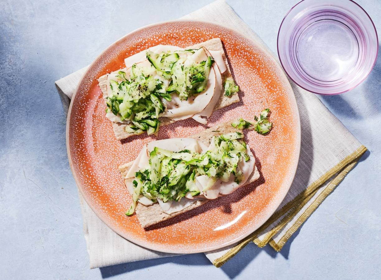 Beleg de volkorencrackers met rijstbloem met de flinterdunne kipfilet en verdeel de courgette-dillesalade erover.
