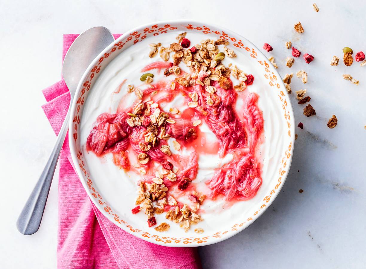 De rabarbercompote maakt van deze yoghurtbowl een prachtig plaatje. Dit ontbijt wil jij in de lente zeker maken!