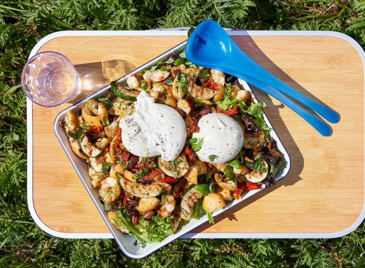 Eenpansgenot op de camping: deze originele maaltijdsalade met gegrilde courgette en burrata.