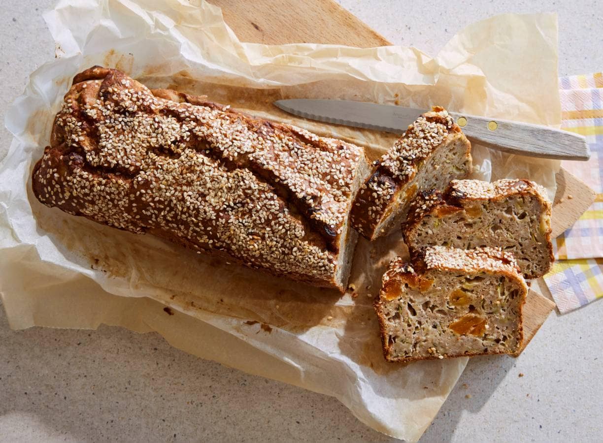 Klop de eieren los in een ruime kom en meng met de banaan, olie en tahin. Voeg het volkorentarwemeel met de bakpoeder, koek- en speculaaskruiden en de helft van het sesamzaad toe. Meng de abrikozen, geraspte courgette en eventueel zout erdoor.