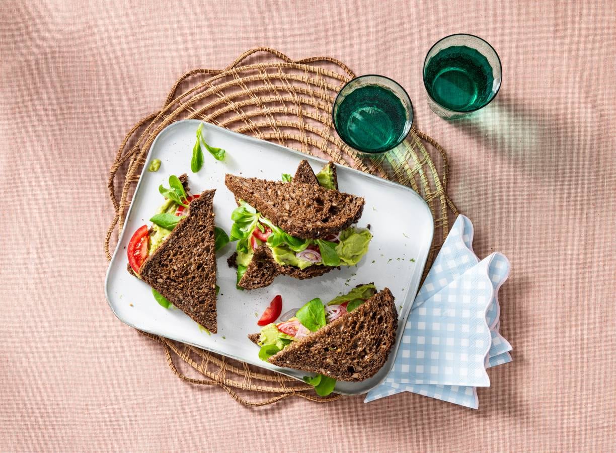 Bestrijk de helft van de sneetjes brood met de smashed avocado en bestrooi met de limoenrasp. Verdeel de plakjes tomaat, de veldsla en sjalot erover. Breng op smaak met peper en eventueel zout. Dek af met de rest van het brood. Druk voorzichtig aan, snijd diagonaal door en serveer direct.