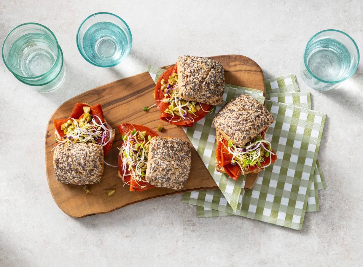 Snijd de broodjes open en beleg met de groenteplakjes, het olijvenmengsel en de kiemgroente.