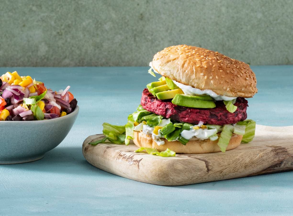Een prachtig plaatje, boordevol groente en vegan: deze bietenburger met zwartebonen-maissalade en jalapeño is een feest op tafel. Ga jij stapelen?