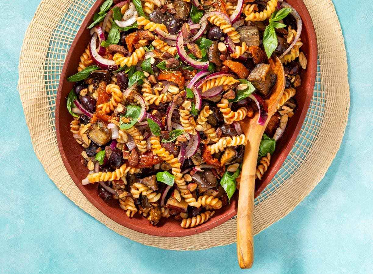 Vul je pastasalade met semi-gedroogde tomaten, olijven en aubergine. Garneer met verse kruiden en gerookte amandelen voor extra smaakplezier.