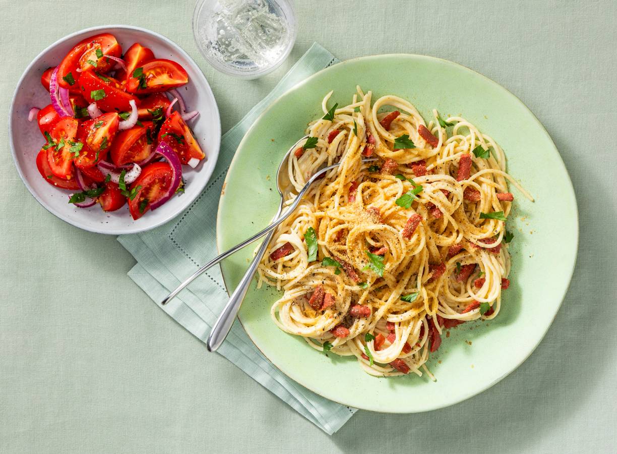 Plantaardige spekjes, sojaroom en vegan ei komen samen in dit recept voor vegan pasta carbonara. Heerlijk met verse peterselie en een tomatensalade.