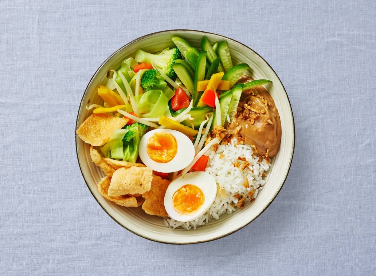 Een vegetarisch gerecht met pindasaus en knapperige groenten geïnspireerd door Indonesische gado gado. Met dit voorgesneden verspakket van Albert Heijn ideaal, want daadrdoor staat-ie in een kwartier op tafel. Top af met een eitje om het af te maken!