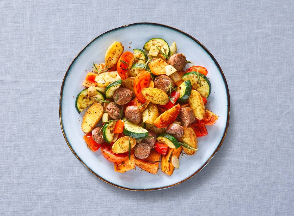 Meng op een bakplaat de krieltjes, paprika, courgette, tomaat, ui, knoflook, rozemarijn, zoete aardappel en plakjes braadworst met de rest van de olijfolie en de kruidenmix. Meng goed door elkaar.