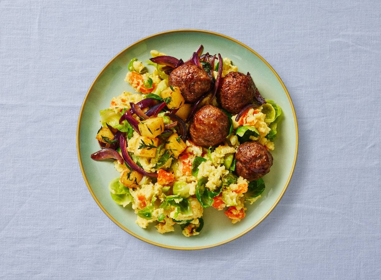Serveer de stamppot met de gebakken ui, appel, tijm en gehaktballetjes.