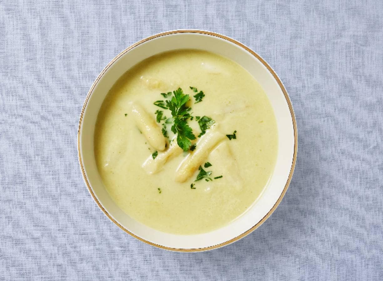 Aspergesoep maken? Goed idee! Dat doe je met aardappelen, kookroom en een vleugje kerrie. Garneer met peterselie en roep de gasten maar aan tafel!