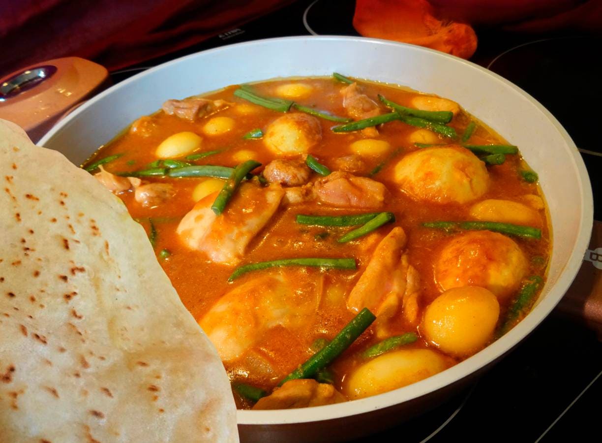 Ui (in halve ringen) en knoflook (geperst) in de overgebleven olie lichtbruin fruiten. Kipdijfilet (in reepjes gesneden) hieraan toevoegen en met deksel op de pan, onder af en toe omscheppen, gaarbakken. Roti Masala Trafasie, Trassie Trafasie, aardappels, sperziebonen (in stukjes gesneden) en eieren toevoegen en omscheppen.
