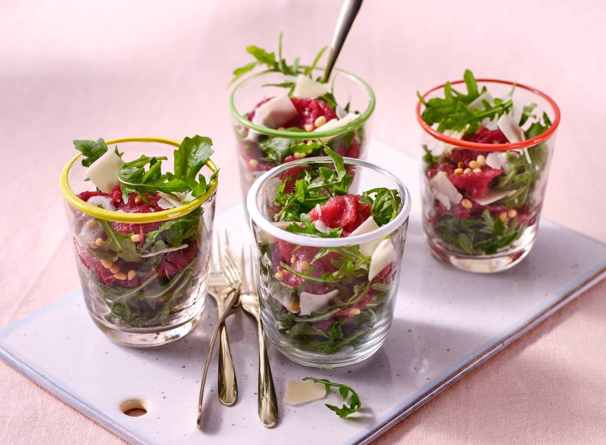 Houd een paar blaadjes rucola achter. Verdeel achtereenvolgend de helft van de rucola, carpaccio, truffelmayonaise, kaas en pijnboompitten uit de verpakking over de glazen en bestrooi met peper en eventueel zout. Herhaal met de rest van de ingrediënten en de peper en eventueel zout en garneer met de achtergehouden blaadjes rucola.