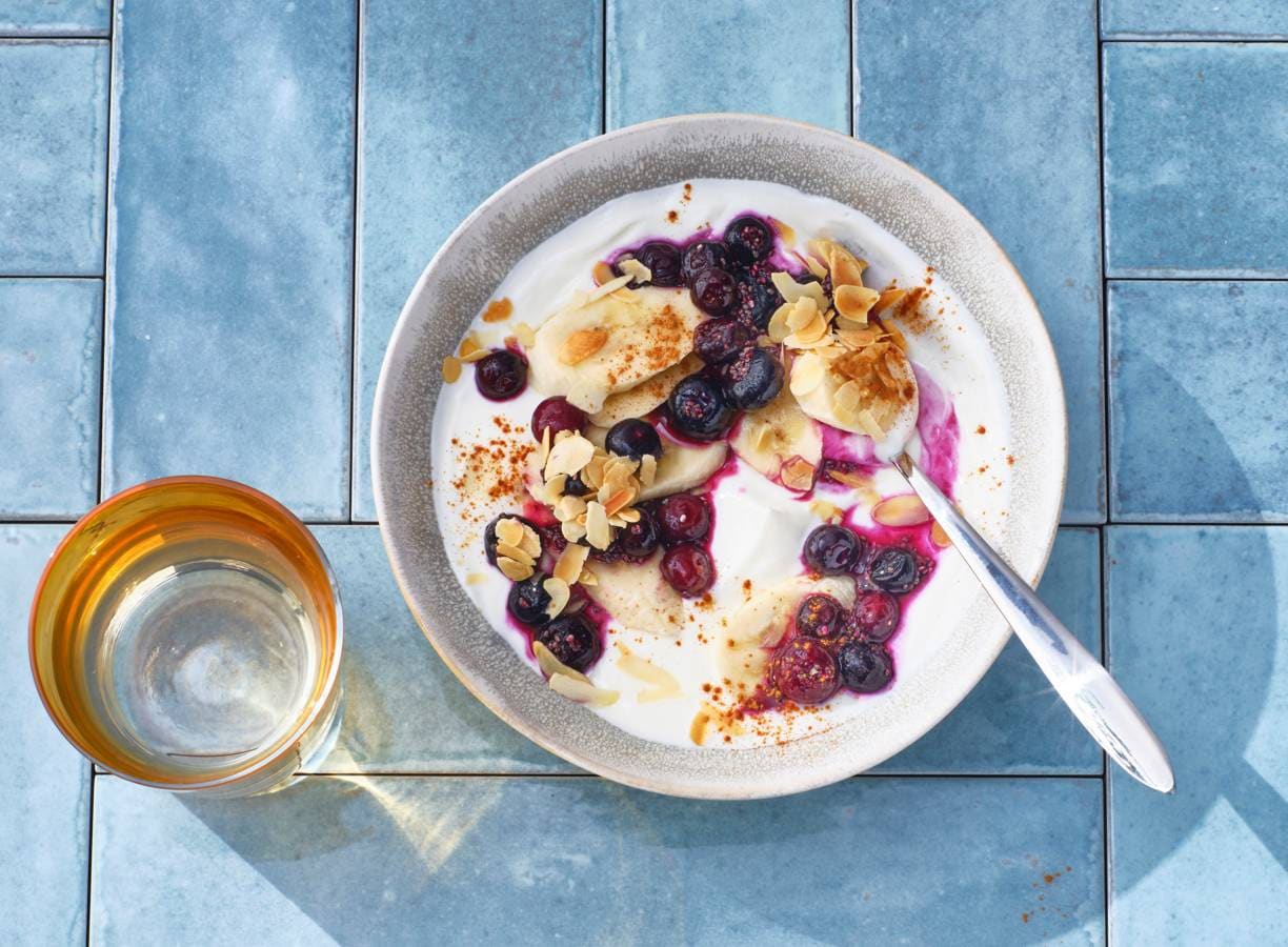 Een yoghurtbowl met bessenspread, banaan en amandelschaafsel: dát is pas een goed begin van de dag! Bestrooi met kaneel. Kijk je al uit naar morgenochtend?