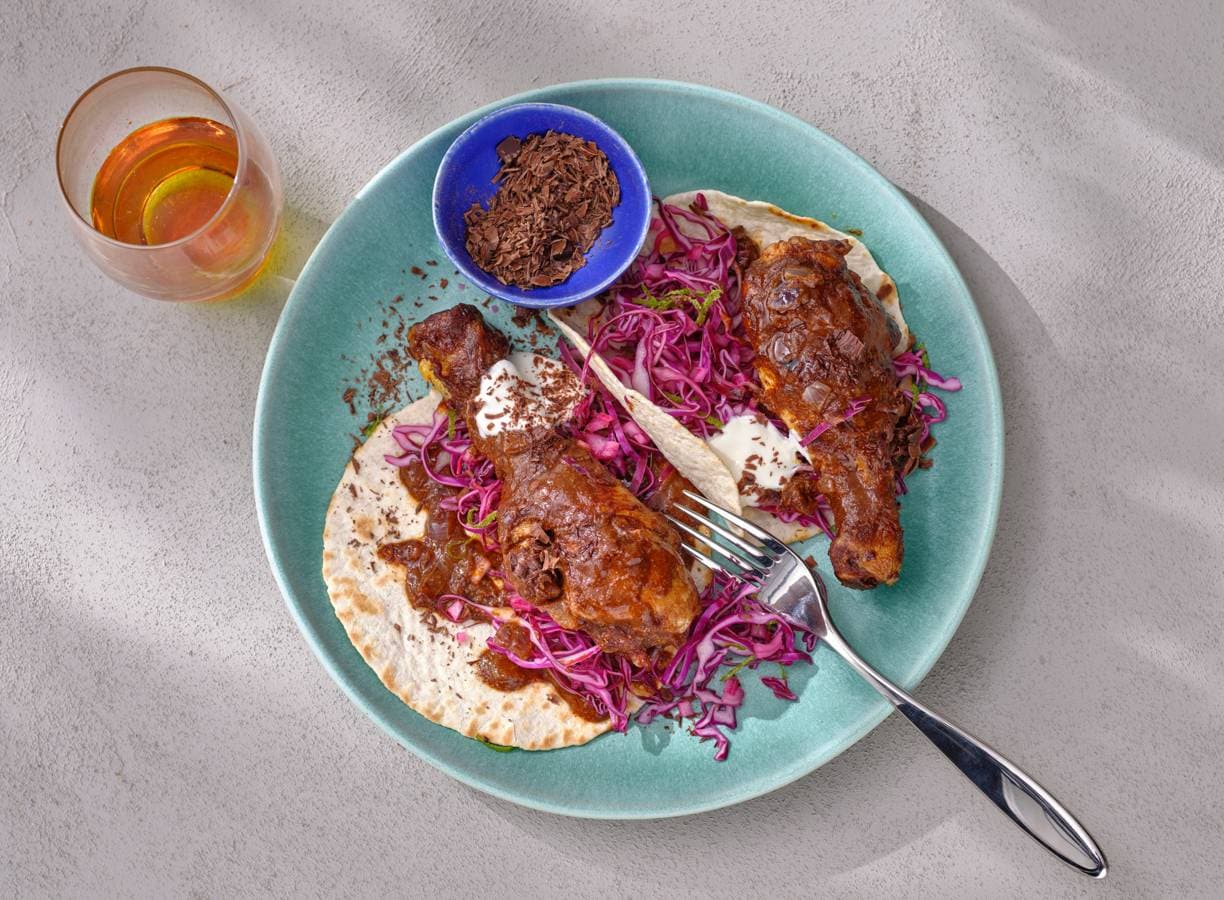 Kipstoof met chocolade-chipotlesaus en tortilla's