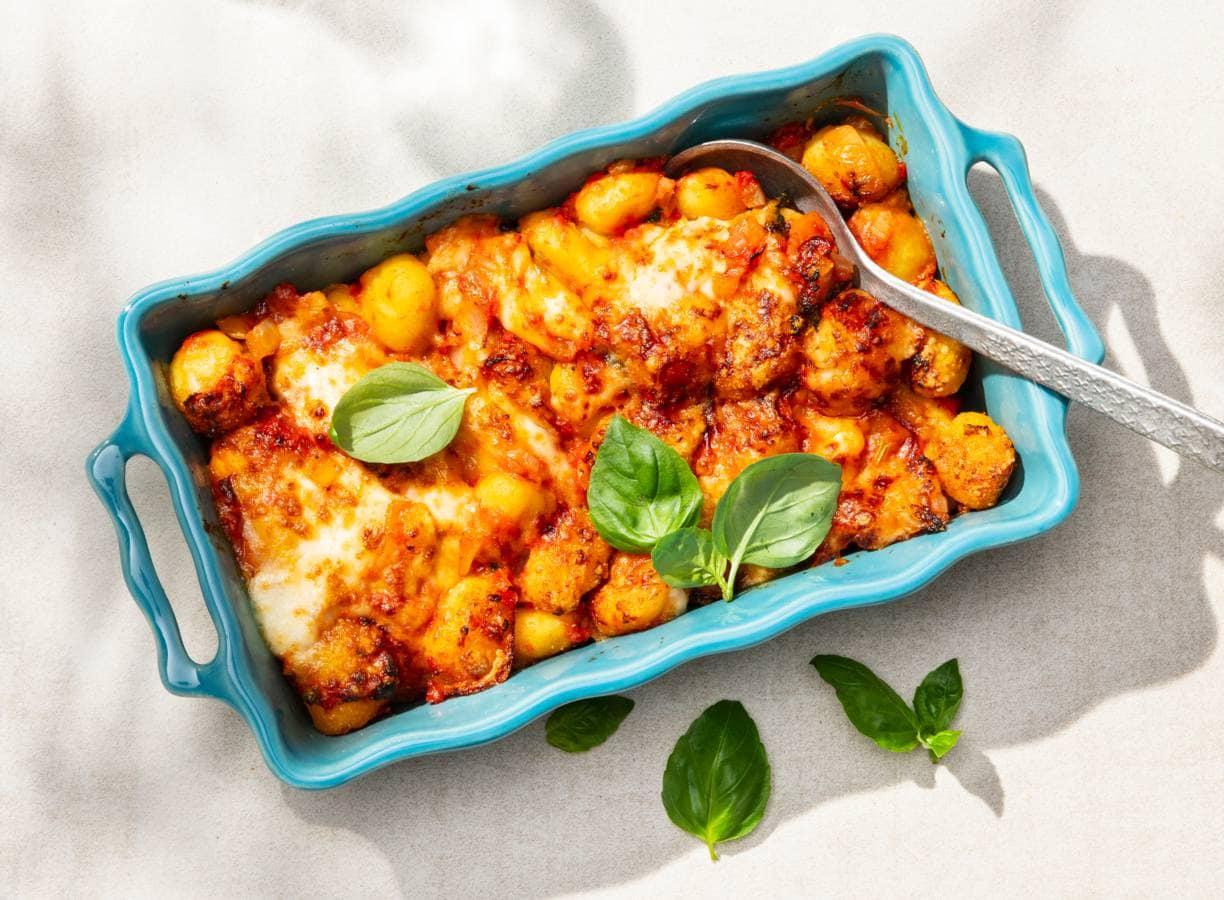 Gnocchi alla Sorrentina is comfort food op z’n Italiaans: zachte gnocchi, rijke tomatensaus met ui, knoflook en basilicum, afgetopt met gesmolten mozzarella en Parmezaanse kaas.