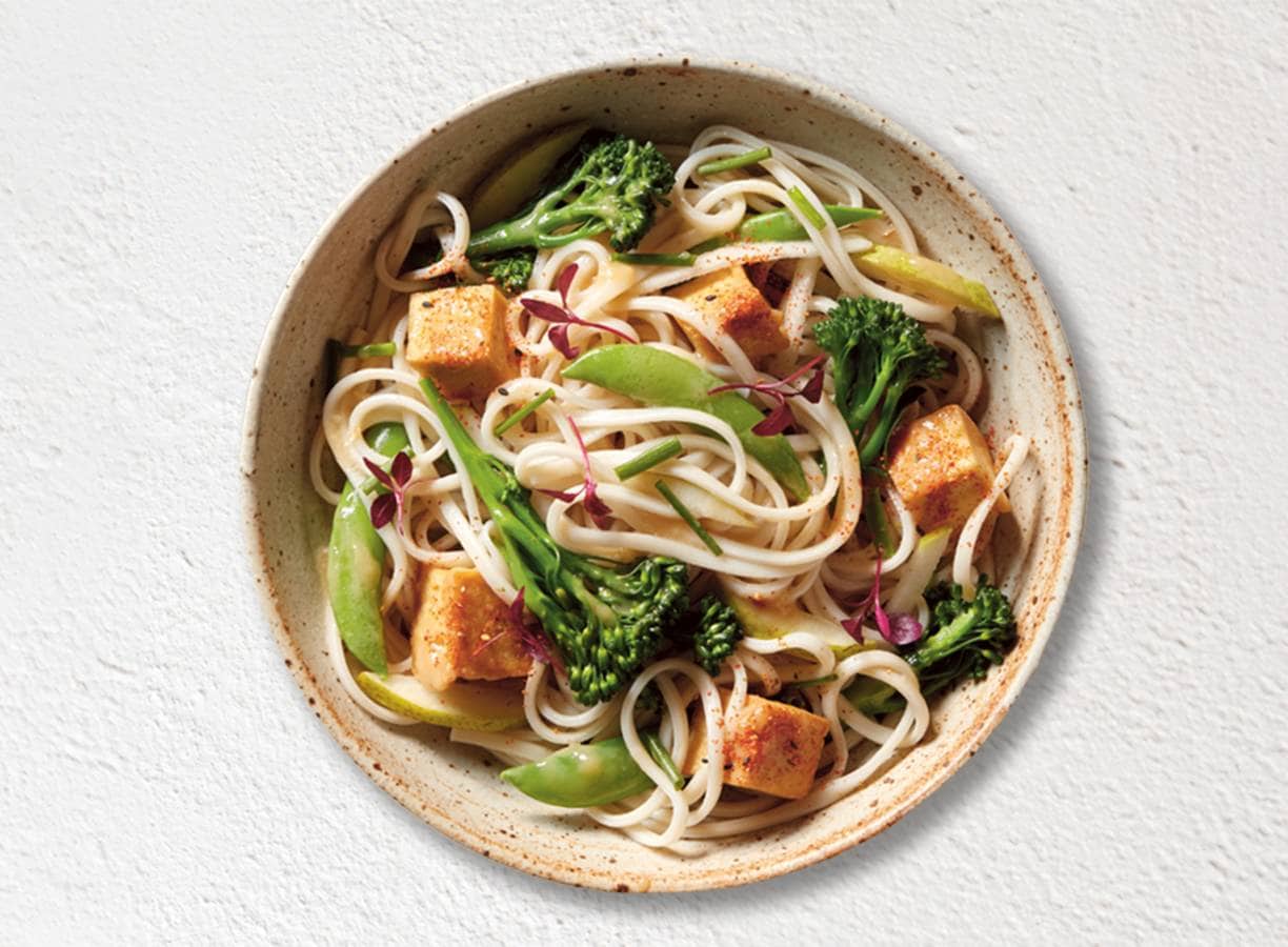 Udonsalade met tofu, bimi en peer van Hakubaku (advertentie)